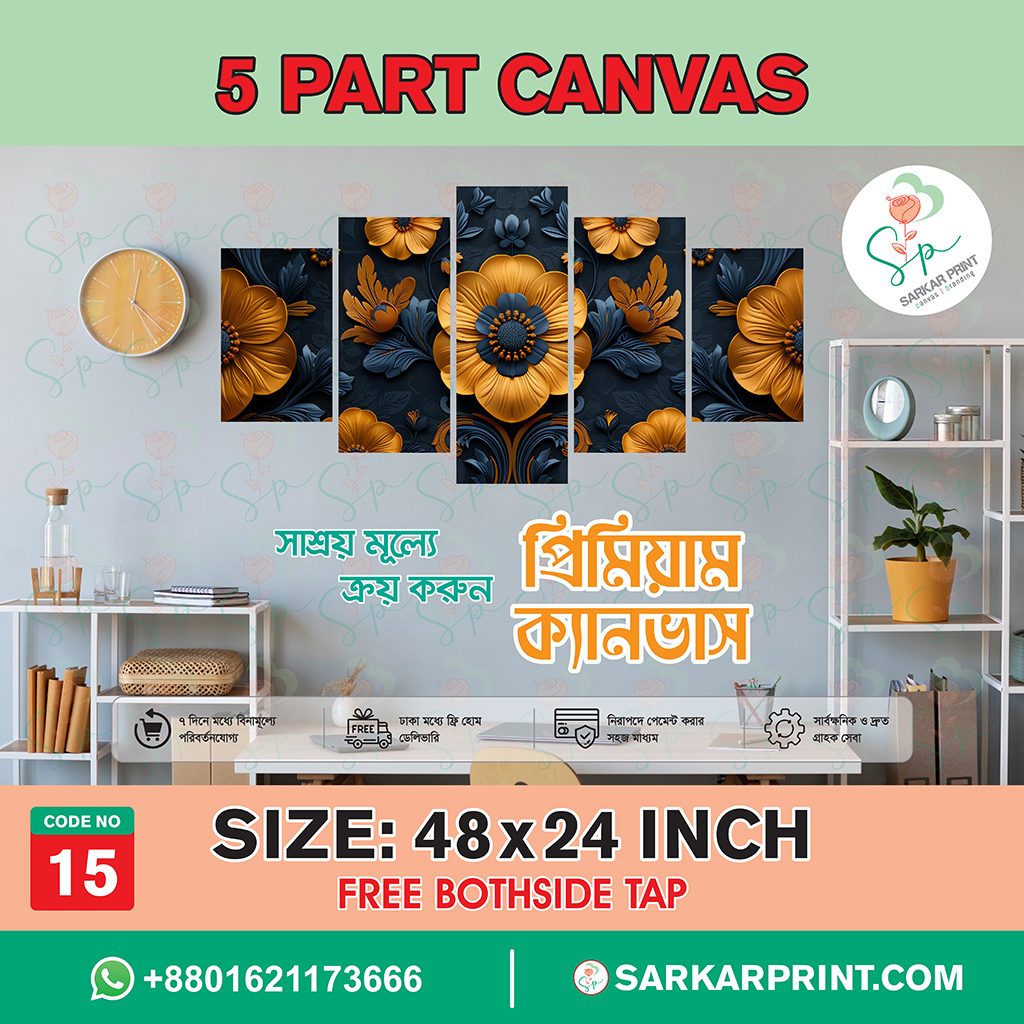 Elevate your home’s aesthetic with this luxurious 5-part premium canvas wall art. The artwork features an elegant abstract design of golden leaves with birds and a glowing sun, set against a sophisticated blue and gold background. This 5-panel set is printed on high-definition premium canvas to ensure a gallery-quality finish. It is a perfect choice for adding a touch of modern luxury and serenity to your living room, bedroom, or office.