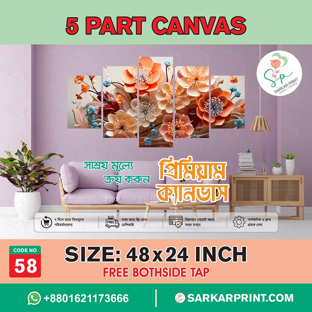 Transform your living space with the expansive 48×24 inch 5-Part Peach & Blue Rose Reverie Canvas (Code 58). Features a high-quality premium print across five panels and includes free installation tape.