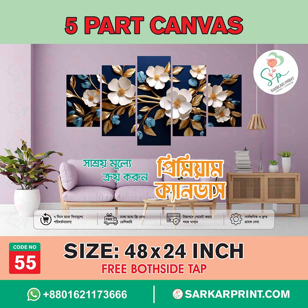 Add a layer of timeless elegance to your home with this premium 5-part split canvas wall art. The artwork features a stunning contemporary design of layered white blossoms with intricate gold-leaf detailing and delicate blue floral accents. Set against a deep, moody background, this high-definition print on premium quality canvas is spread across five panels to provide a grand, panoramic effect, making it a sophisticated centerpiece for any modern living room or master suite.