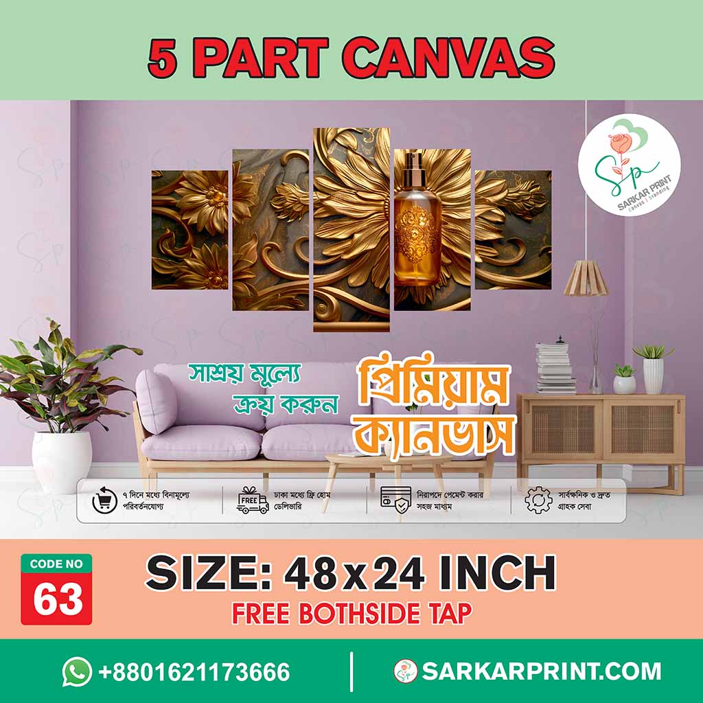 Bring a touch of palatial luxury to your home with this premium 5-part split canvas wall art. The design features a magnificent 3D-effect centerpiece of a golden perfume bottle surrounded by masterfully crafted, embossed golden floral motifs and baroque architectural swirls. This high-definition print on premium quality canvas is spread across five vertical panels to create an opulent and grand focal point, perfect for a high-end dressing room, luxury spa, or a sophisticated master bedroom.